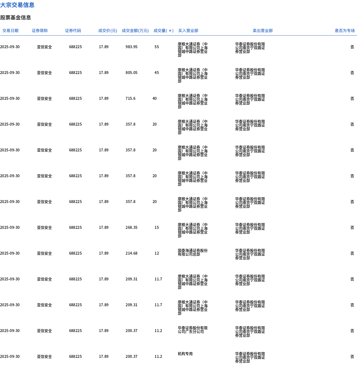 9月30日三亚股票配资,亚信安全大宗交易成交292.8万股,成交额5238.19万元,占当日总成交额的16.94%,成交价17.89元,较市场收盘价21.9元折价18.31%。